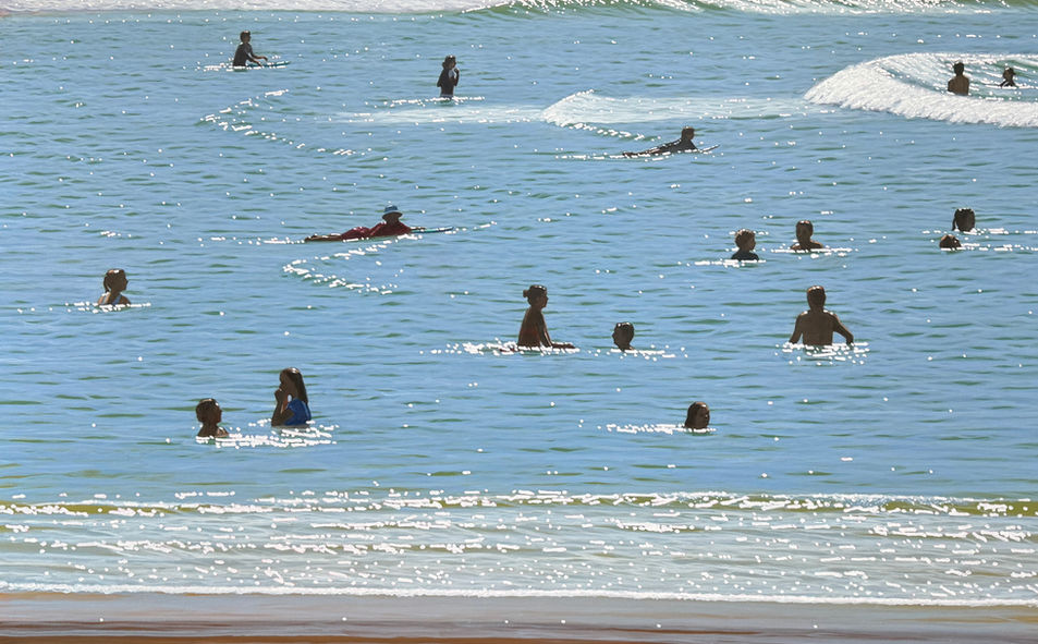 Through shifts in scale and perspective, from lively groups of bathers to solitary swimmers to open expanses, I aim to reveal the subtle interplay between people, water, and land. Together, the works form a quiet meditation on connection and belonging within the natural world.